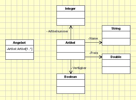 Die Assoziation zwischen den Klassen Angebot und Artikel ist nun durch eine Eigenschaft Artikel in der Klasse Angebot ausgedrückt. Diese Eigenschaft ist vom Typ Artikel. Es ist außerdem angegeben, dass in dieser Eigenschaft mehrere Objekte gespeichert werden können, mindestens aber ein Objekt enthalten sein muss. Man gibt die Multiplizität hierzu in eckigen Klammern hinter dem Typ an.